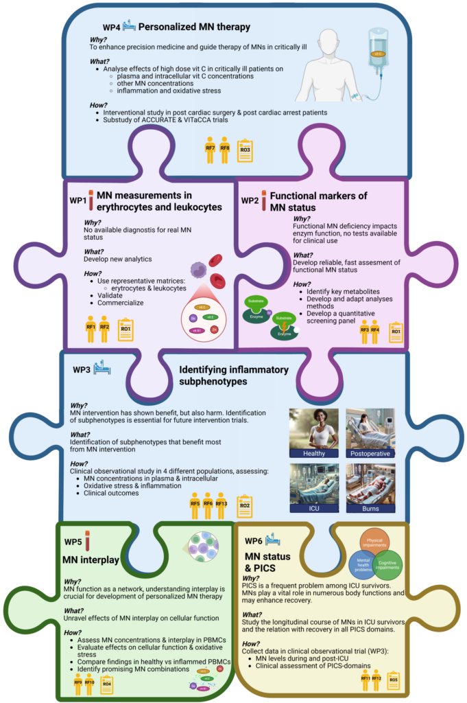 The purpose of WP5 is to combine a systematic review with in‑depth experimental studies in peripheral blood mononuclear cells (PBMCs) from healthy adults and critically ill patients. It aims to investigate how different micronutrients interact, how they affect cellular metabolism and mitochondrial function, and how these relationships change under inflammatory conditions.